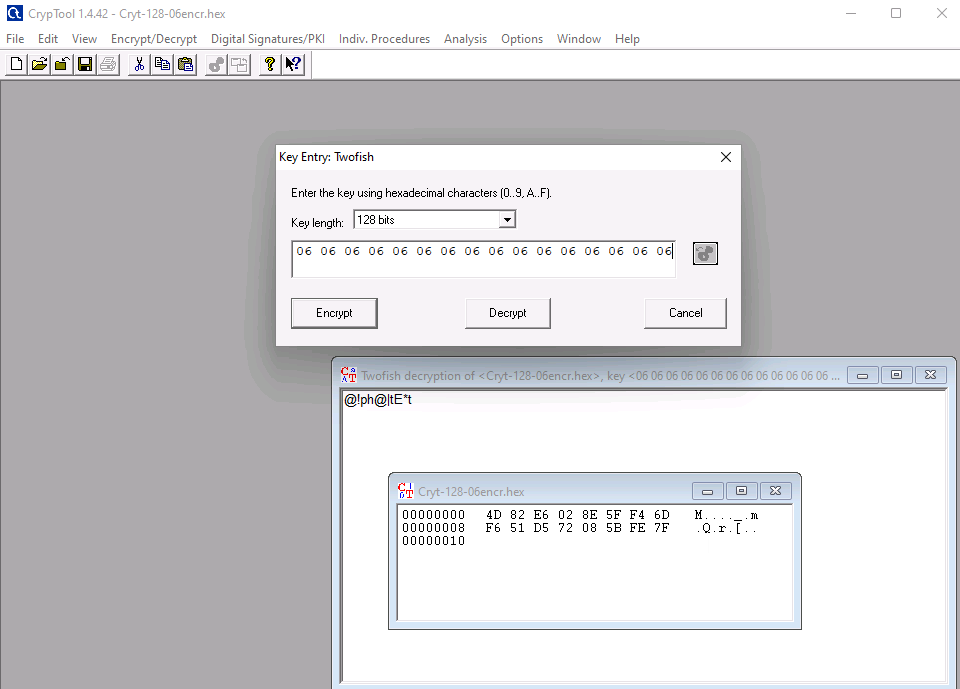 14. An attacker had sent a file cryt-128-06encr.hex containing ransom file password, which is located in documents folder of EH-workstation-2. You are assigned a task to decrypt the file using cryp tool. Perform cryptanalysis, Identify the algorithm used for file encryption and hidden text. Note: check filename for key length and hex characters. (Format: Aaaaaaa/aaaA*a)