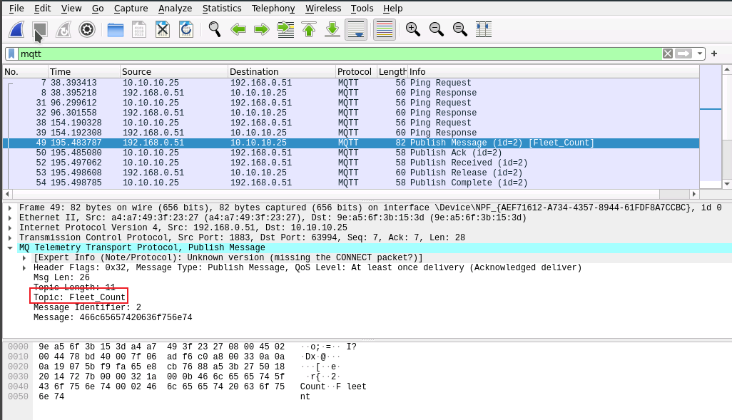 7. CEHORG hosts multiple IOT devices and sensors to manage its supply chain fleet. You are assinged a task to examine the file "IOT Traffic.pcapng" located in the Home directory of the root user in the "EH Workstation - 1" machine. Analyze the packet and find the topic of the message sent to the sensor. (Format: Aaaaa*Aaaaa)