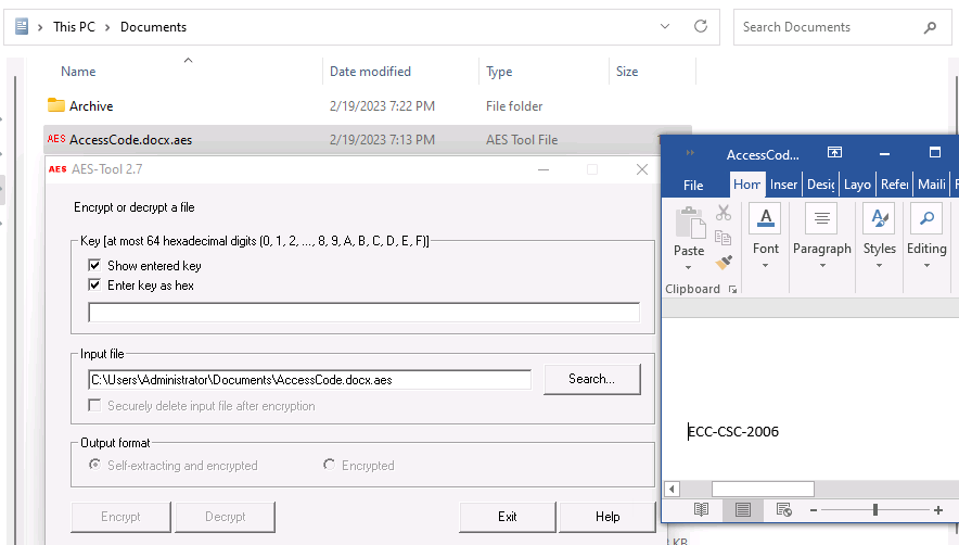 12. The Access code of an employee was stolen from the CEHORG database. The attacker has encrypted the file using the Advance Encryption Package. You have been assigned a task to decrypt the file; the organization has retained the cipher file ""AccessCode.docx.aes"" in the Document folder in the ""EH Workstation – 2"" machine. Determine the access code by decrypting the file. Hint: Use ""qwerty"" as the decryption password. Note: Advanced Encryption Package is available at E:\CEH-Tools\CEHv12 Module 20 Cryptography\Cryptography Tools. (Format: AAAAAANNNN)
