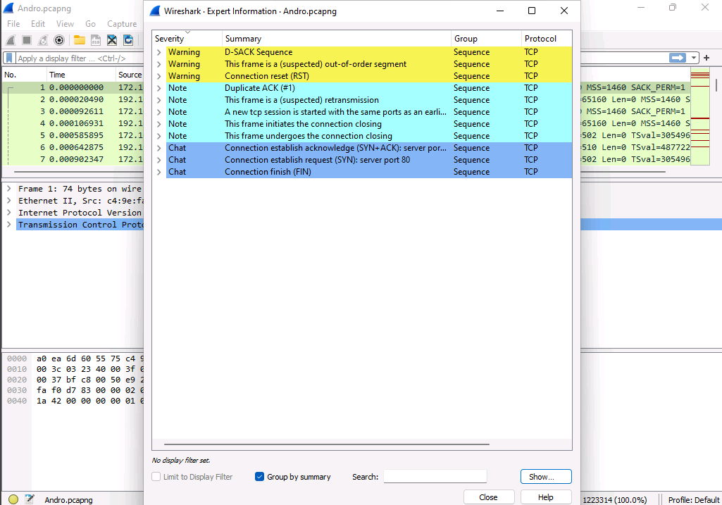 1. The mobile device of an employee in CEHORG has been hacked by the hacker to perform DoS attack on one of the server in company network. You are assigned to analyse "Andro.pcapng" located in Documents directory of EH workstation-2 and identify the severity level of the attack. (Note: perform deep down Expert Info analysis). (Format: Aaaaaaa )